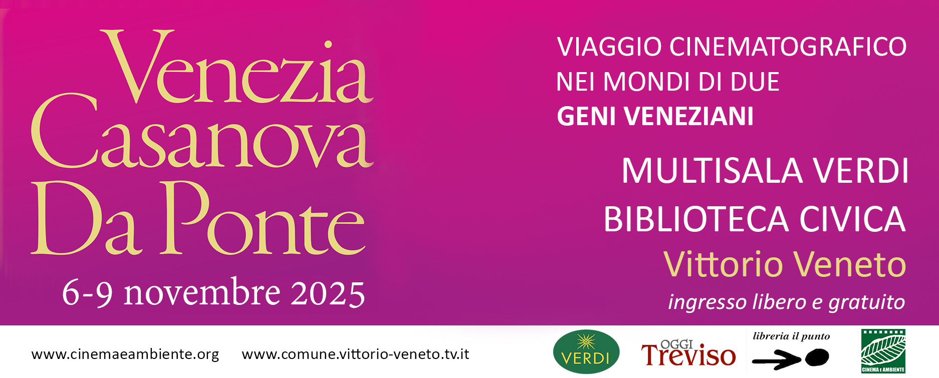 Nell’anno in cui si celebrano i 300 anni della nascita di Giacomo Casanova - e la Città di Vittorio Veneto omaggia le figure di Casanova e Da Ponte - l'Associazione Cinema e Ambiente ha curato una rassegna cinematografica che presenta le figure dell’avventuriero e del libertino settecentesco a cui sono stati associati i due scrittori, attraverso l’interpretazione critica di alcuni registi cinematografici. Una selezione di film che permette di riconoscere come il dispositivo cinematografico produce non solo divismo e mitologia, ma anche una profonda riflessione critica e storica.