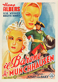 La visione del film tedesco, Il Barone di Münchhausen, uscito in piena guerra nel 1943, ci rivela come la macchina cinematografica possa fornire un importante supporto culturale e propagandistico alla macchina bellica, attraverso il mito e l’esaltazione dell’eroe. Nel film, l’aitante Münchhausen riceve a Venezia dall’ormai vecchio Casanova, le “consegne” di suo successore, a suggello di un’eredità non solo “mitica” tra l’italico e il germanico.